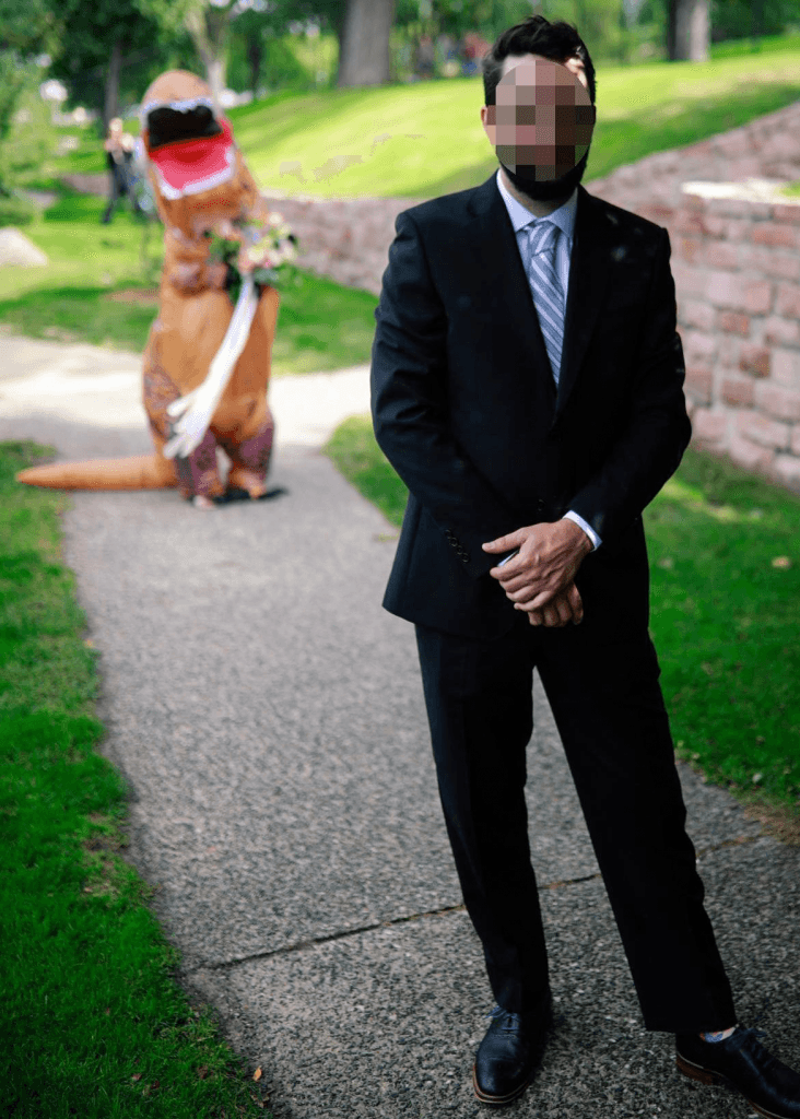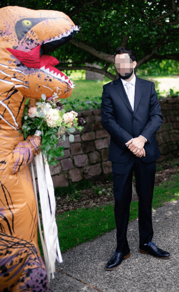 A series of photos shows the bride approaching the groom who had his back facing the other way. Hoping to turn around to see his wife-to-be all dressed in white, he instead saw an inflatable prehistorical creature!
