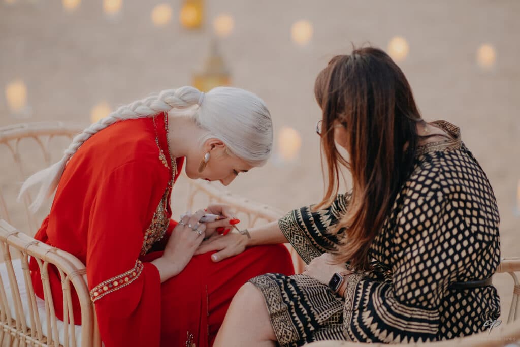 After refreshing from our travels, we were picked up and embracing Emirati elegance headed to an enchanting desert dinner at the exquisite Nara Desert Escape. Immersed in the rich tapestry of Arabic culture, we adorned ourselves with henna, calligraphy, danced to the tabla beats, and experienced the allure of an enchanting oud perfume station where we created signature scents.