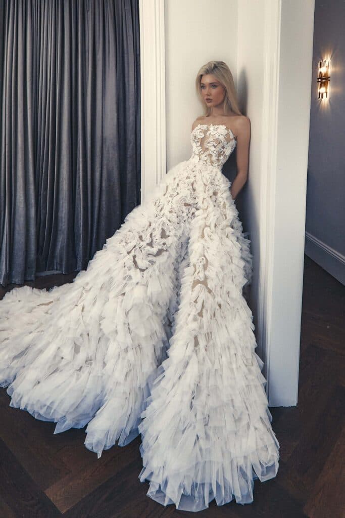 The ‘Maison Collection’ allows clients to select from a range of exquisite gowns, each crafted with unparalleled attention to detail. These pieces feature luxurious materials such as French laces, mikado, silk organzas, the finest silk taffeta, and Steven Khalil’s distinctive hand beading.