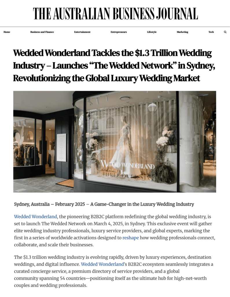 Wedded Wonderland has been featured in the Australian Business Journal for its groundbreaking initiative, The Wedded Network. As a leader in the luxury wedding industry, Wedded Wonderland continues to redefine the global wedding space by creating a seamless ecosystem for high-net-worth couples and wedding professionals.