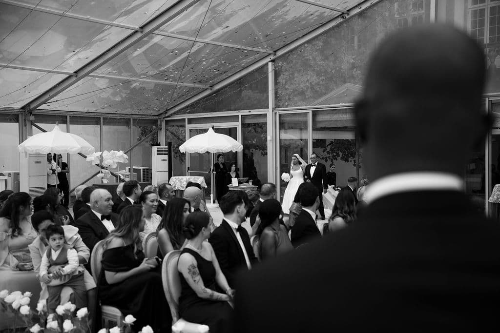 “Five hours before the ceremony, all of our vendors—the wedding planner, event team, florists, rentals, and the palace staff—were running against the clock to dismantle the setup outside due to heavy winds and rain and move everything into a tent. As a bride, I was devastated, and I cried a lot. However, when I walked down the aisle, I felt an overwhelming sense of calm and grace, realizing that despite our high expectations, we were truly blessed to be surrounded by loved ones, starting the most beautiful chapter in the book of our lives in a magnificent palace.”