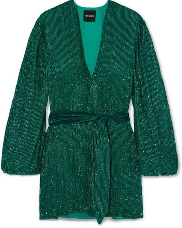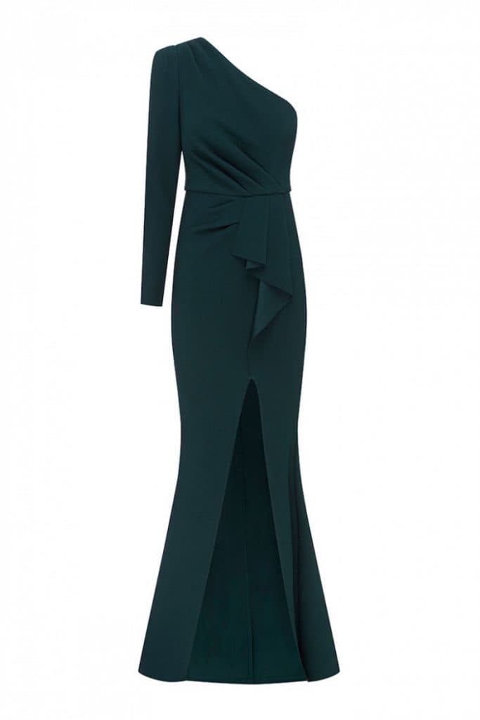 A statement sleeve and gathering at the waist creates an elegant look in a beautiful forest green shade, perfect for winter. Complete the look with statement earrings and faux fur jacket to walk to and from the wedding venue.